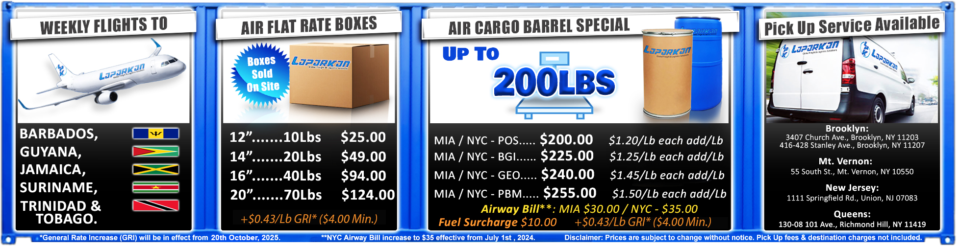 Laparkan Airways is a Leading provider of Air Freight services to the Caribbean for more than nineteen years, serving Trinidad, Guyana, Barbados and Suriname directly.